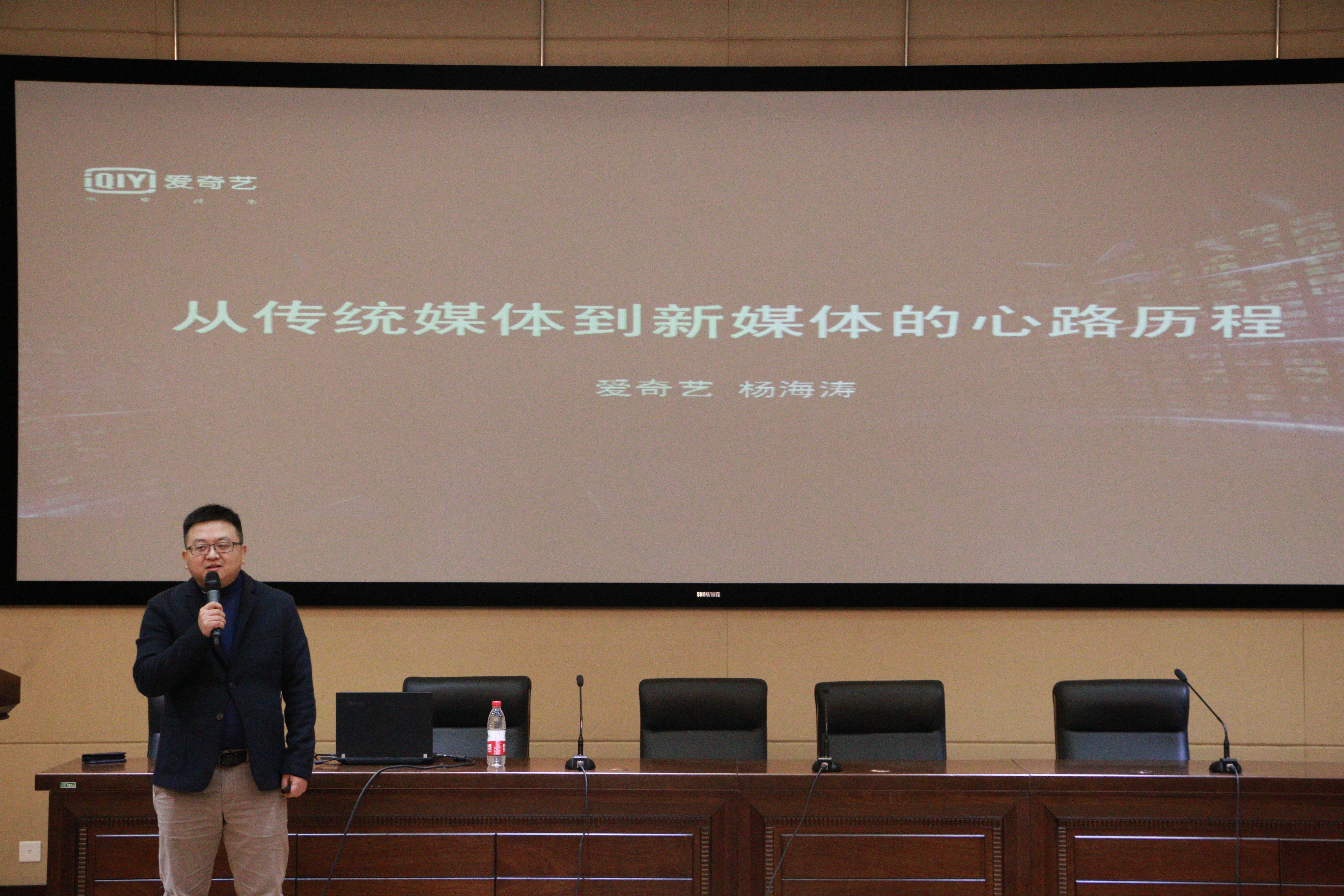 11月2日晚7点,在我校莲湖校区学术报告A厅,爱奇艺副总裁杨海涛应邀来我校作题为“从传统媒体到新媒体的心路历程”的专题讲座。讲座由文学与传播学院院长杜松柏教授主持。