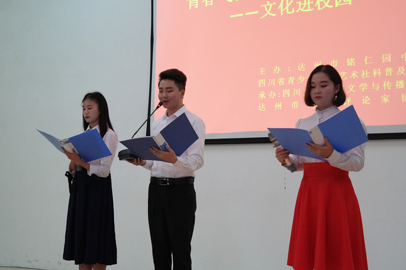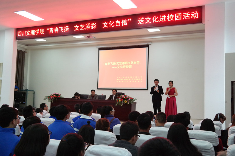 2017年11月16日下午,四川省青少年文学艺术社科普及基地与达州市文艺评论家协会联合组织文学与传播学院部分普及专家和学生以及教师教育学院部分学生成功开展主题为"青春飞扬、文艺添彩、文化自信"的送文化进校园文艺普及活动。