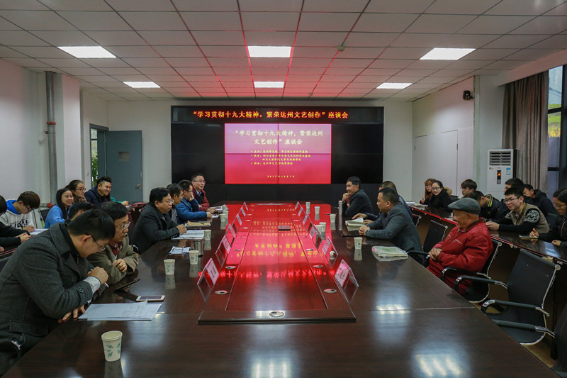 2017年12月7日下午15:00,"学习贯彻十九大精神,繁荣达州文艺创作"座谈会在莲湖校区艺术传媒大楼1007会议室召开,会议由达州市文联、市文联文学创作基地主办,四川省青少年文学艺术社科普及基地、四川文理学院文学与传播学院承办,达州市文艺评论家协会协办。达州市本土作家、文艺界代表以及文传学院部分师生也参加了此次会议。整场会议学术氛围浓厚,作家与学生之间交流互动频繁。会议由文学与传播学院院长杜松柏教授主持。