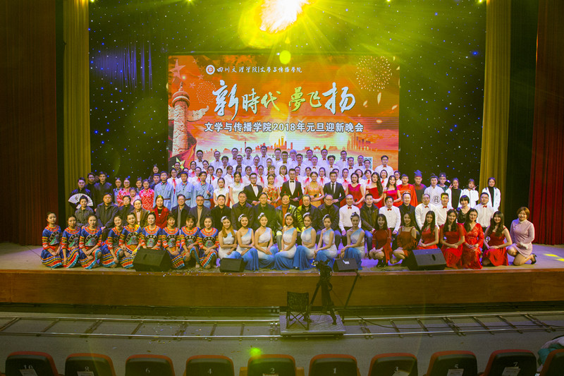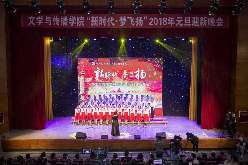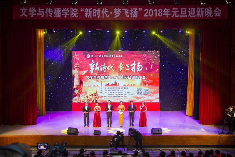 迎新年,贺元旦,新时代,梦飞扬。2017年12月19日晚,由文学与传播学院主办的2018年元旦迎新晚会在艺术传媒大楼多功能厅炫目起航,图书信息大楼学术报告厅B厅作为分会场进行实况转播。学校党委书记、博士生导师王成端教授、市广播电视台、市诗词协会、市摄影家协会、市电视艺术家协会、学校职能部门等应邀出席晚会,学院全体师生观看本场晚会。