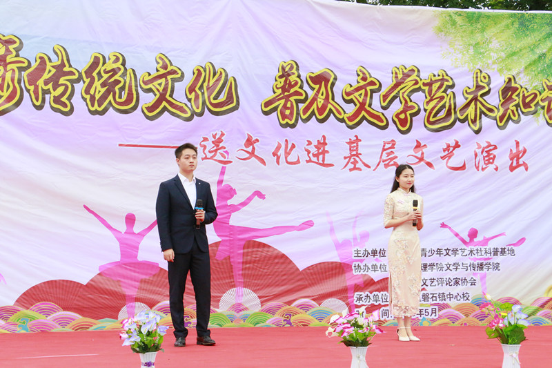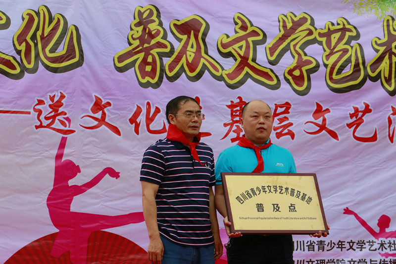 演出开始前,首先由磐石镇中心校校长张凯讲话,他对文理学院师生的到来表达了热烈的欢迎和衷心的感谢,并希望在社会各界的的支持与帮助下,磐石中心校可以不辜负外界的支持帮助,从而攀登到更好的平台。而后是授牌环节,四川省青少年文学艺术社科普及基地主任、文传学院副院长彭金祥教授,授予磐石镇中心校“四川省青少年文学艺术社科普及基地普及点”标牌。