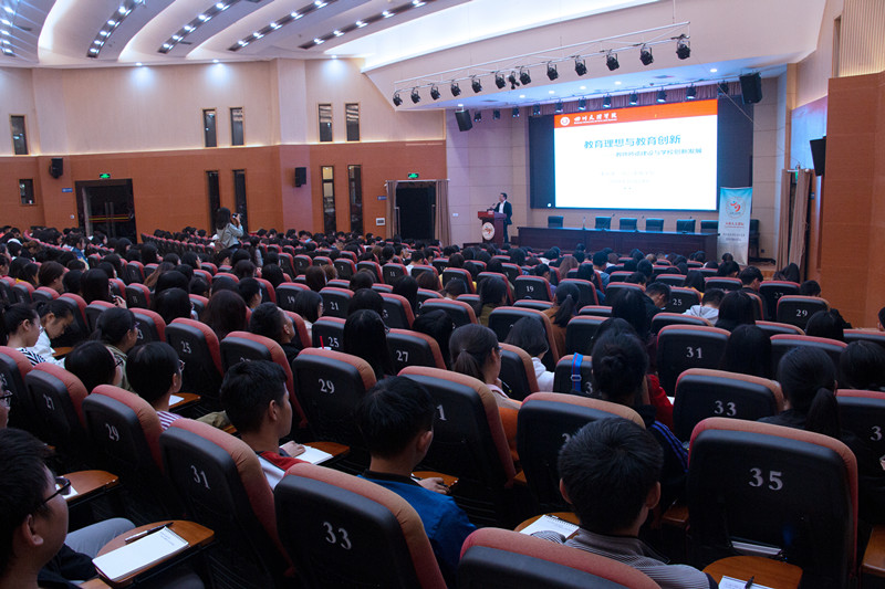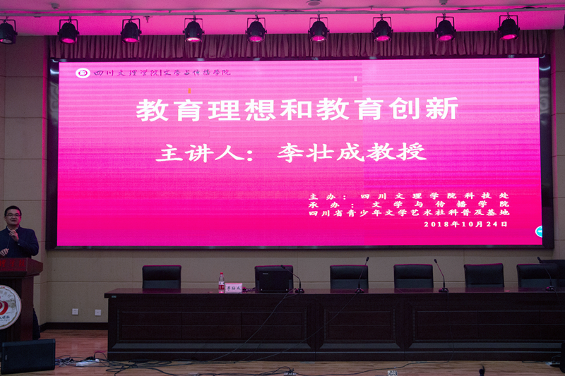 2018年10月24日晚,校教学名师、校学术带头人、四川文理学院副校长李壮成教授在莲湖校区学术报告厅A厅为文传学子带来学术讲座。此次讲座的主题是“教育理想与教育创新”。本场讲座由文学与传播学院院长杜松柏教授主持,文学与传播学院、数学学院、外国语学校、教师教育学院中的师范专业生共400余名同学到场聆听讲座。本次学术报告由四川文理学院科技处主办,四川省青少年文艺普及基地和文学与传播学院承办。
