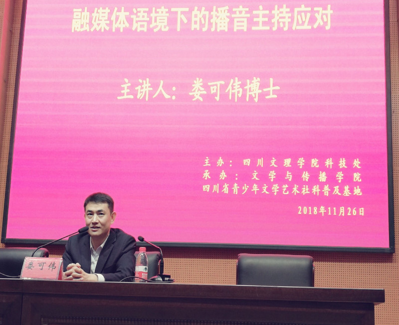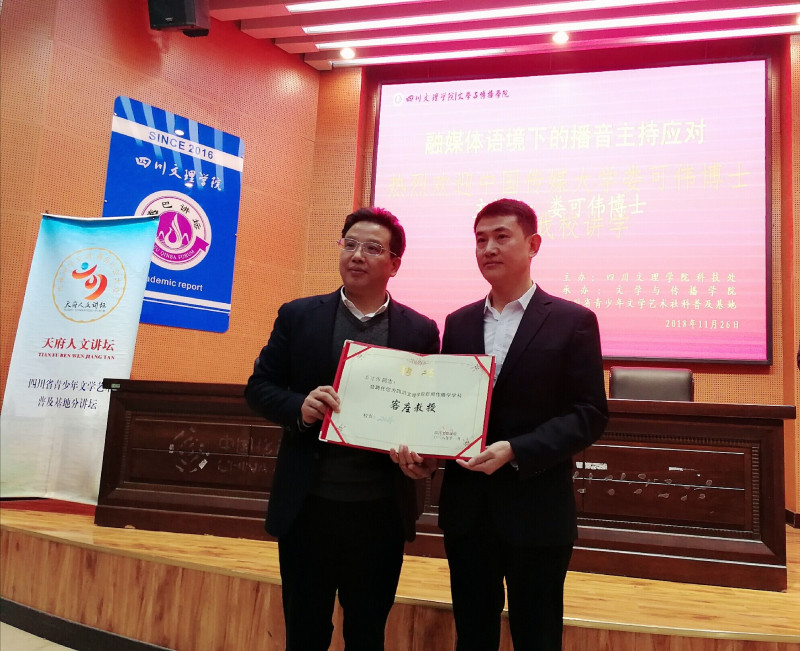 11月26日下午,中国工商银行总行驻川定点扶贫组组长、四川省南江县委副书记、中国传媒大学娄可伟博士应文学与传播学院和四川省青少年文学艺术社科普及基地的邀请,莅临学校作“融媒体语境下的播音主持应对”学术报告,报告由文学与传播学院院长杜松柏教授主持,文传学院部分老师和学生聆听讲座。学校副校长李壮成教授为娄可伟博士颁发客座教授聘书。