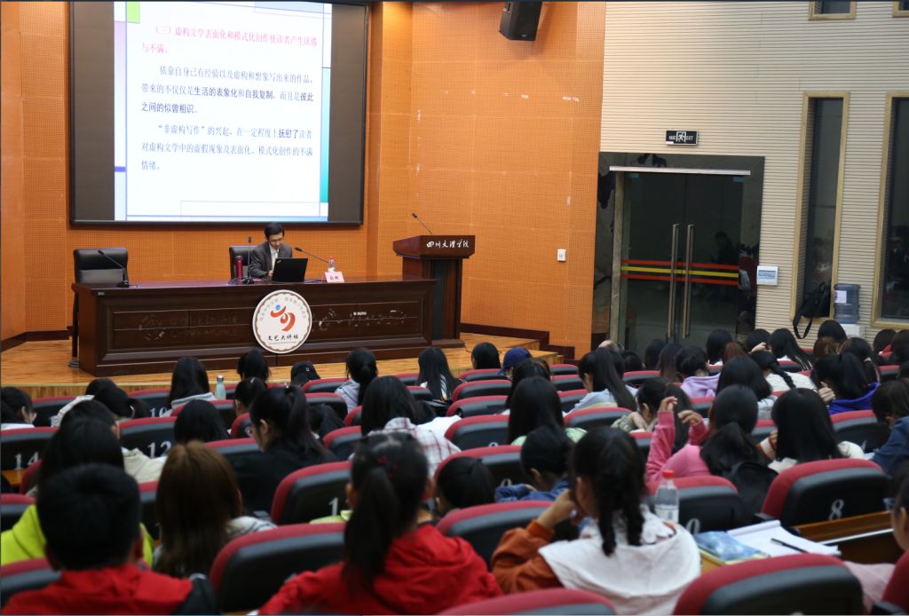 10月14日晚,张松副教授为文传学子作主题为《“非虚构写作”的价值及其局限》的学术报告。此次讲座由学校科技处主办,文学与传播学院、四川巴山作家群研究院、四川省青少年文学艺术社科普及基地承办。讲座由文学与传播学院副院长彭金祥教授主持,四川青少年文化艺术社科普及基地主任赵定贵教授出席讲座,200余名文传学子到场聆听讲座。