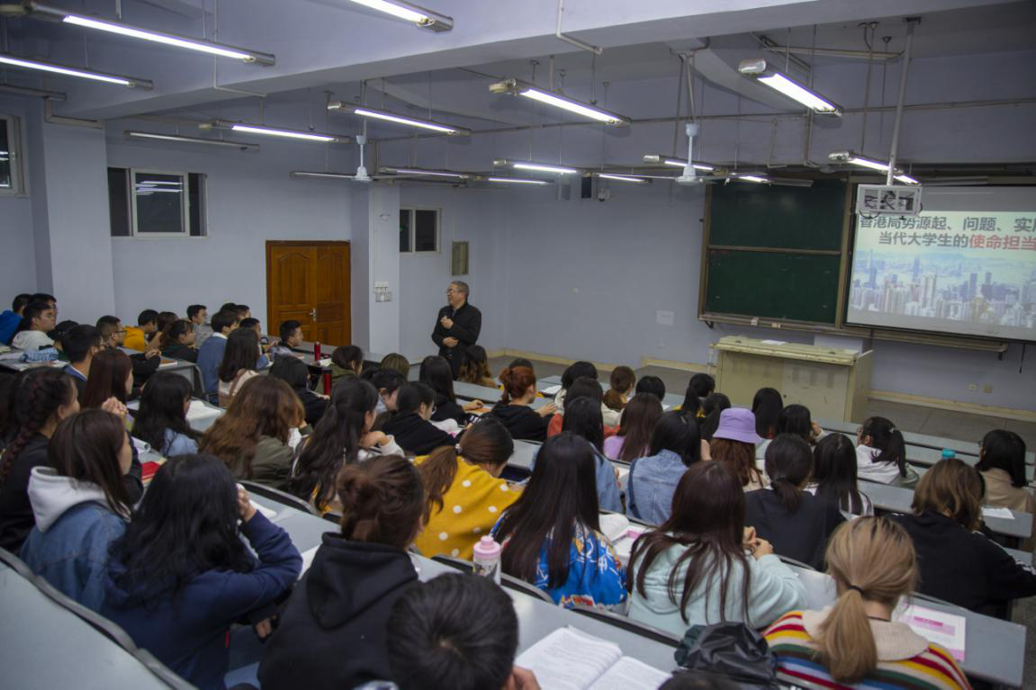 11月4日晚,学校副校长徐晓宗教授在博文楼412教室为我院2018级部分学生讲授题为“香港局势的源起、问题、实质”的形势与政策课。