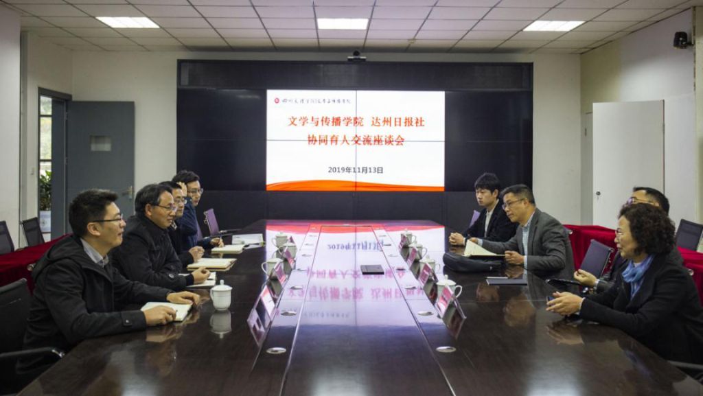 为顺应媒体融合的趋势,加强学院新闻传播人才培养与相关行业单位的合作,切实培养高素质应用型人才,11月13日上午,我院与达州日报社在艺术传媒大楼1007会议室召开了协同育人交流座谈会。达州日报社总编辑李清、副总编李晓兵、人力资源部主任戴晓娟,学院院长曾宪文、正处级组织员张波、副院长张桢出席本次会议。双方就如何协同育人,加强合作展开深入的交流,并商定了共建实习实训基地相关事宜。
