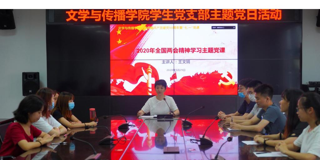 文学文化党支部根据自身实际情况,把主题党日活动、专题党课、重温入党誓词等内容结合起来。党支部书记成立围绕“2020年‘两会’精神”“习近平新时代中国特色社会主义思想”“战‘疫’凸显中国特色社会主义制度优势”等几个主题进行了宣讲。支部各党员同志就“抗疫”期间涌现出的感人事迹以及疫情期间自己的经历进行了交流和分享。