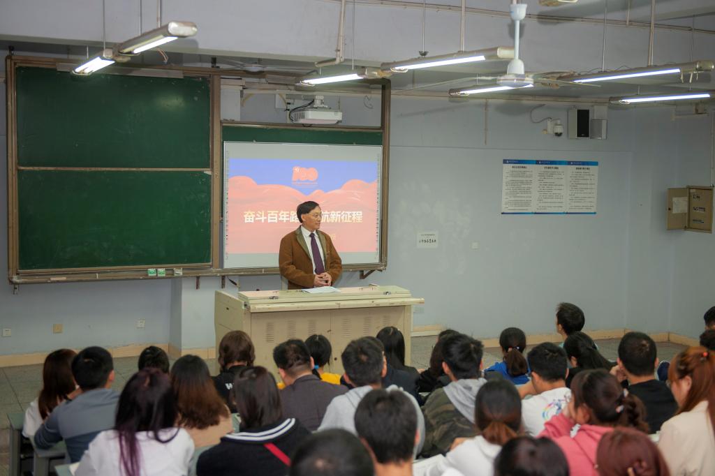 为深入学习宣传贯彻习近平总书记在庆祝中国共产党成立100周年大会上的重要讲话精神,10月25日,校党委书记王成端教授在一教楼413教室为我院学生作题为“奋斗百年路,启航新征程”的形势与政策报告。学院党总支书记冉林、正处级组织员张波、副书记王文娟及学工办全体教师一同参加。
