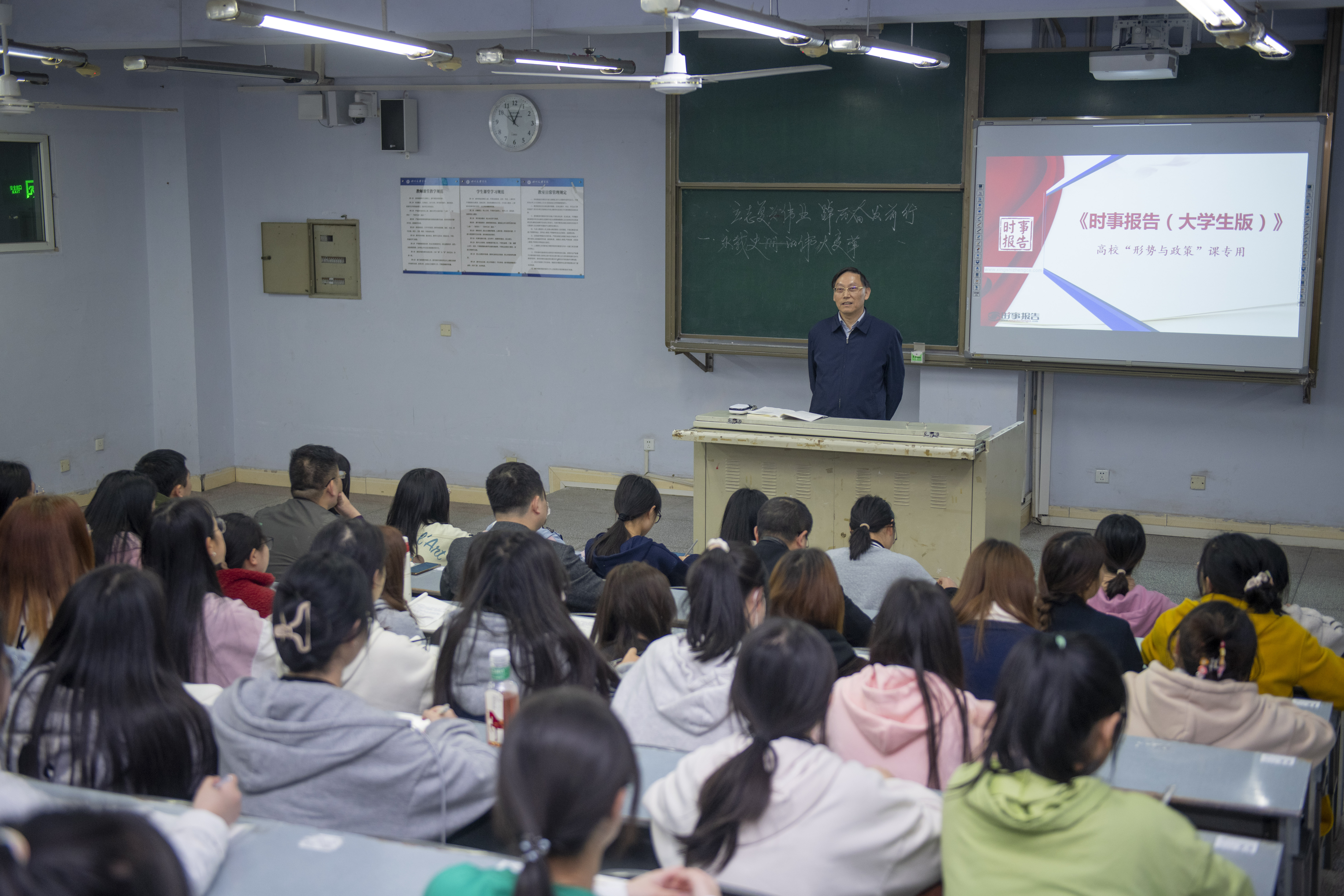 王成端教授强调,当前我国发展进入战略机遇和风险挑战并存、不确定难预料因素增多的时期,必须准备经受风高浪急甚至惊涛骇浪的重大考验,立足新发展阶段,贯彻新发展理念,构建先发展格局,持续推动高质量发展。要紧紧依靠党这个“定海神针”,坚定不移走好自己的路,让人民过上好日子,我们党依靠斗争走到今天,也必然要依靠斗争赢得未来。王成端教授还通过课堂提问的方式,加强与学生的互动交流,增加了课堂的趣味性,调动了学生的积极性。