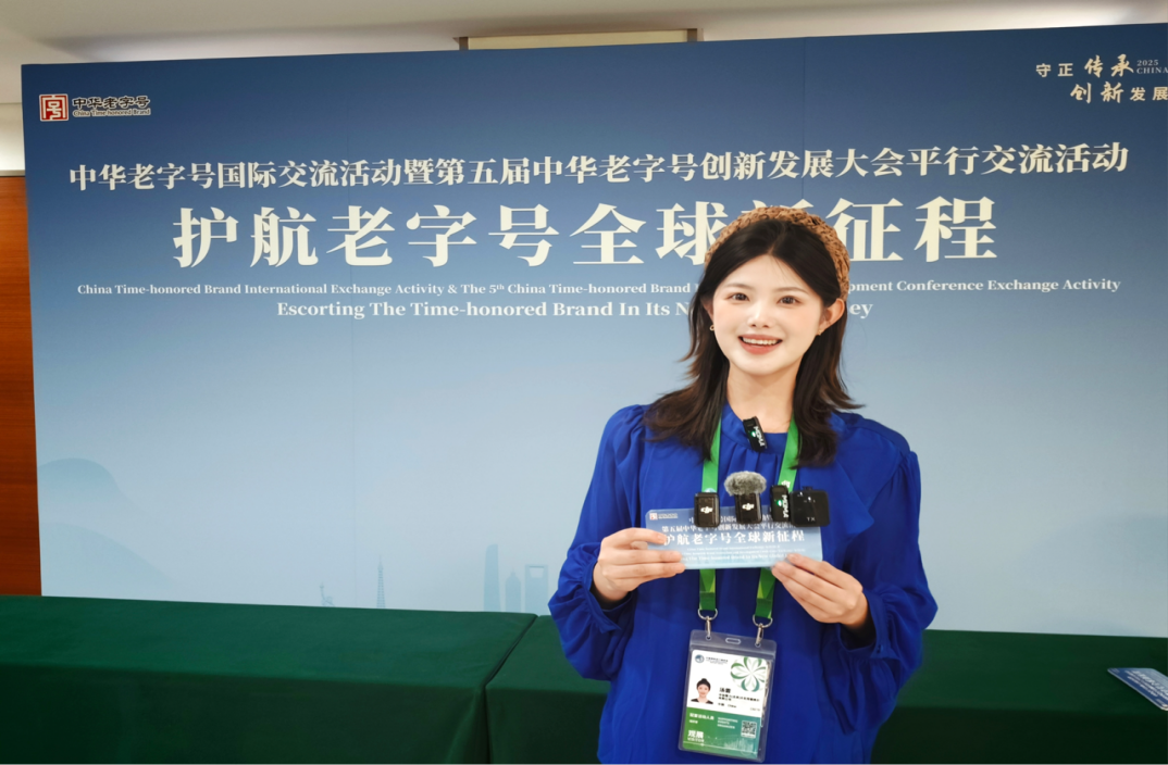 本届进博会吸引了155个国家、地区和国际组织参展,展览面积与企业数量均创历史新高。对播音与主持艺术专业而言,这正是一场检验“理论+实践”教学成果的高规格平台。在专业教师李林翰“以小切口展现大主题”的传播思维引导下,汤霖精准地聚焦于中华老字号的文化创新与出海故事,展开了为期数天的深入采访。她穿梭于各具特色的老字号展位之间,用话筒捕捉传统工艺的传承脉络,用镜头定格文化创新的生动瞬间,从一款产品、一位匠人、一次合作洽谈切入,通过专业的现场提问和出镜播报,将“老手艺”的文化底蕴与“国潮”品牌的创新活力,转化为一段段生动的视频和文稿。