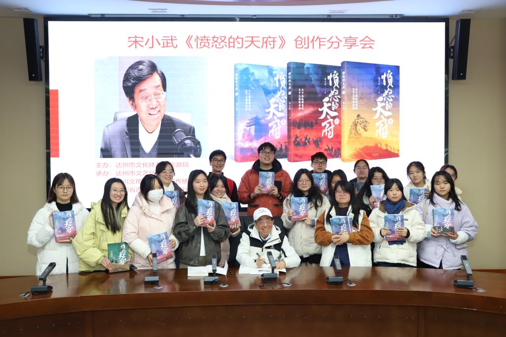 11月26日,由文学与传播学院与达州市文艺创作中心联合承办的一级编剧宋小武长篇小说《愤怒的天府》创作分享会在学校弘德楼二楼会议室举行。达州市文艺创作中心主任罗嘉琳主持分享会,文学与传播学院院长曾宪文致辞。巴山作家群研究院专家姚春等教师以及星光文学社成员、文学爱好者到场参加。