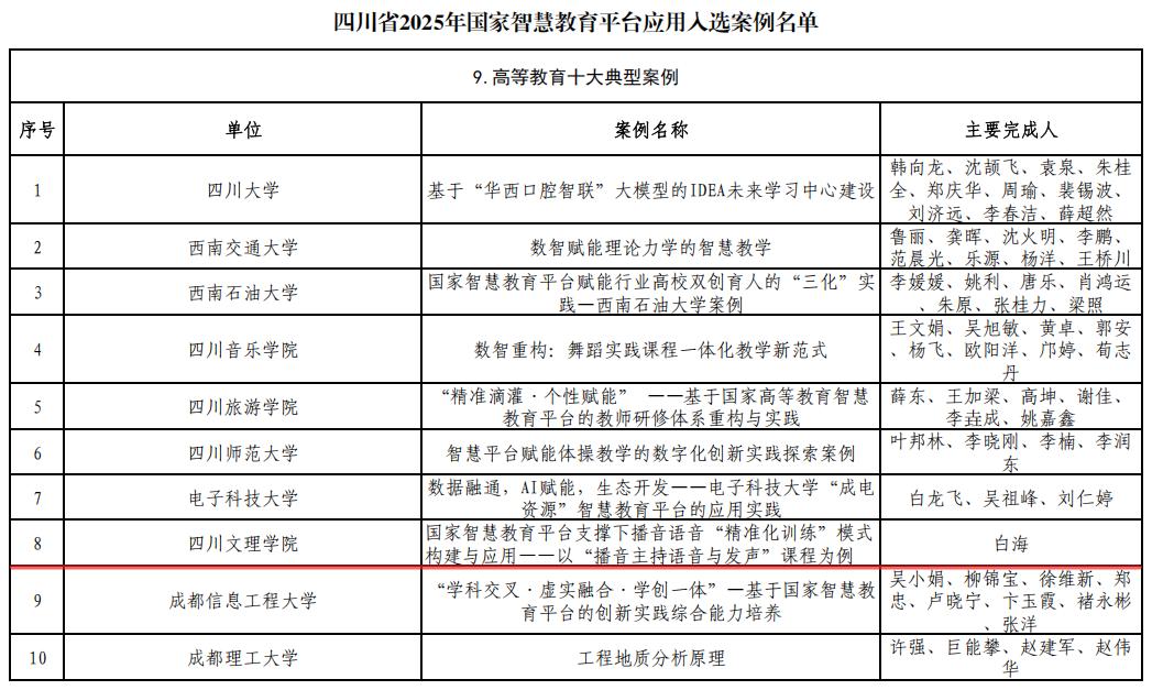 近日,四川省教育厅发布了《关于公布2025年国家智慧教育平台应用案例评选结果的通知》,我院白海教授独立完成的案例《国家智慧教育平台支撑下播音语音“精准化训练”模式构建与应用——以“播音主持语音与发声”课程为例》成功入选“高等教育十大典型案例”。
