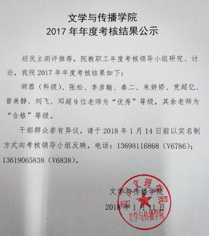 文学与传播学院2017年年度考核结果公示
