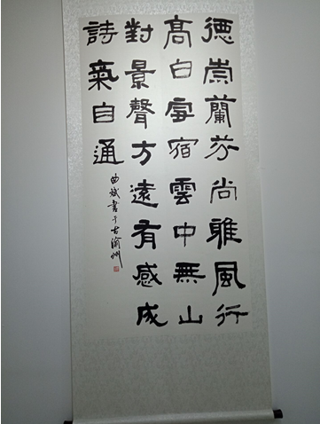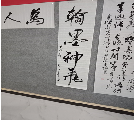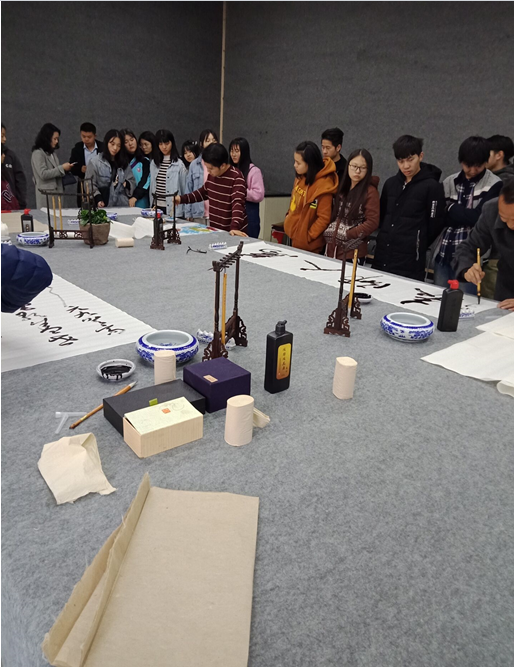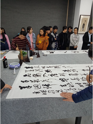 彭教授讲话结束以后,广安各位知名书法家、美术家开始即席挥毫,为大家展示他们的书法、美术作品,他们有的笔墨凝重,端庄大气,有的龙飞凤舞,意气风发,在五尺鲜纸上挥洒自如。基地普及专家尹弈之老师也热情洋溢地书写了自己的作品,送给书院。