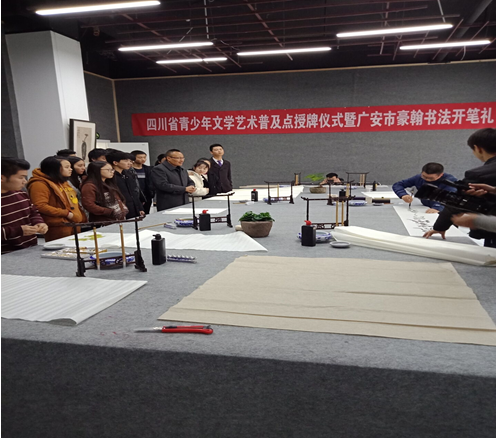 2018年11月7日,四川文理学院文学与传播学院党总支书记赵定贵研究员、四川省青少年文学艺术社科普及基地主任彭金祥教授与基地普及专家、四川文理学院美术学院党总支副书记尹弈之老师,到广安市设立首个普及站点并且参加广安市豪翰书院开笔仪式。广安市有名望的书法家、美术家、部分中学负责人、电子博览城企业老总、培训机构负责人和学生以及广安电视台的记者共100多人参加了该项活动。会议由豪翰书院负责人吴疆先生主持。