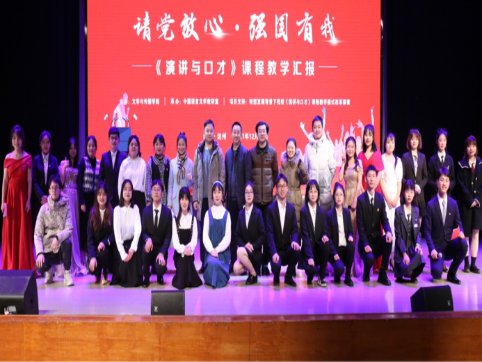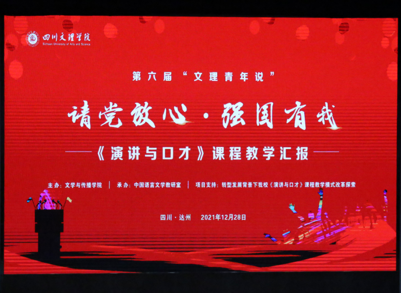 根据学校本科人才培养方案要求,坚持“一专业一赛事,一课程一展演”的专业建设思路,文学与传播学院第六届“文理青年说”《演讲与口才》教学成果汇报于12月28日晚上7点在多功能厅举行,此次汇报展演以“请党放心·强国有我”为主题。文学与传播学院党总支书记冉林、副院长成立、中华传统文化学院副院长熊明川、文学与传播学院辅导员肖旭、吴泉兴等出席此次教学成果汇报。