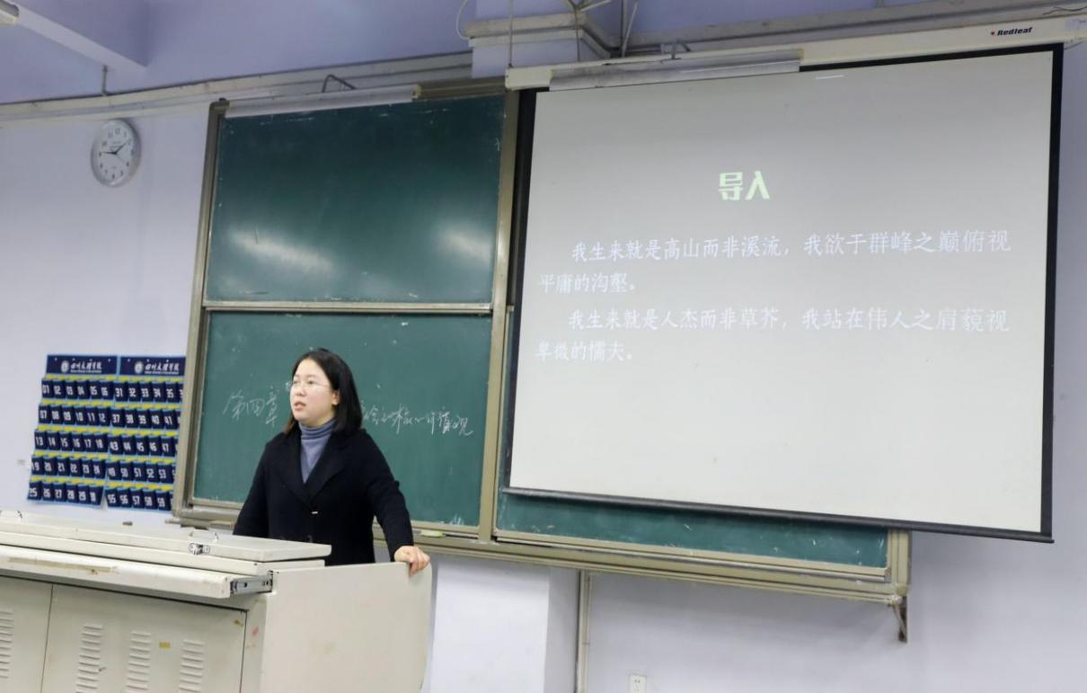 11月21日下午,邱钧燕老师作题为《如何进行诗词教学》的讲座。她以《破阵子·为陈同甫赋壮词以寄之》和《乡愁》为例,给同学们讲解诗词教学中的策略、误区、板书设计,为同学们的诗歌教学打下坚实的基础。