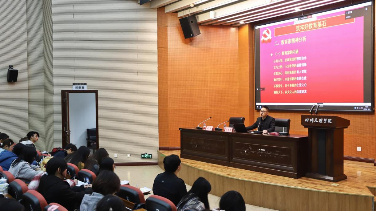 11月18日下午,雷建交老师作题为《牢筑好教育基石》的讲座。他阐释新教师成长培训的重要性和意义,从教师的德、才、行三个方面进行教育家精神分析,希望在座各位同学在未来能够达到生出“讲台味”的境界。