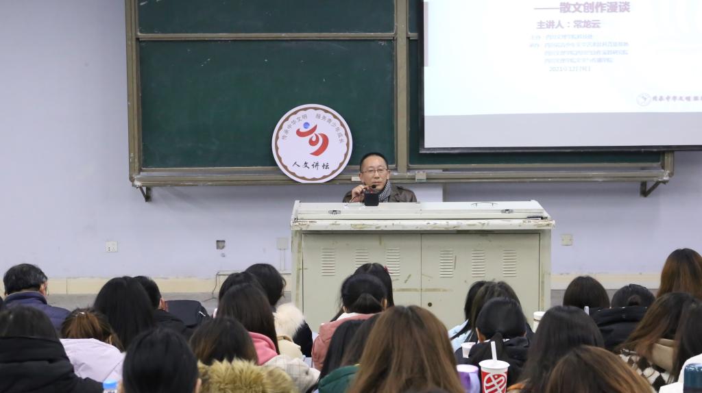 2021年12月9日,《文学创意写作》课程第三课开讲,中国作家协会会员,达州市作家协会常务副主席,达州市委、市政府“文艺名师”称号获得者常龙云先生应邀莅临我校,在莲湖校区博文楼125教室作题为“从心灵出发”的专题讲座。