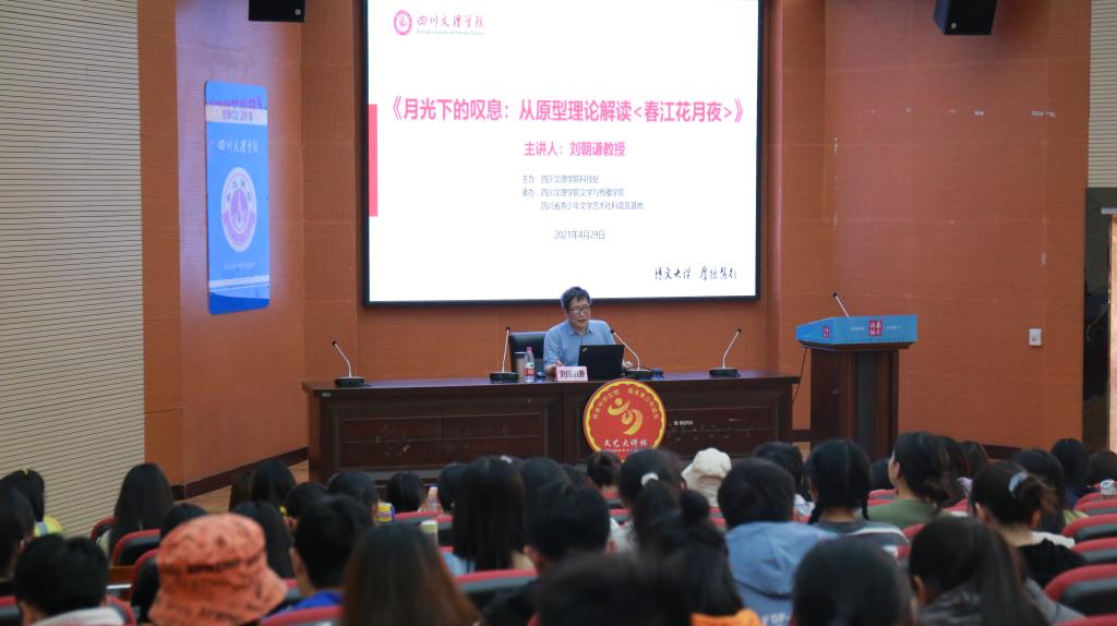 4月29日下午,四川师范大学博士生导师、二级教授刘朝谦应邀作《月光下的叹息:从原型理论解读<春江花月夜>》学术讲座,文学与传播学院院长曾宪文教授主持讲座。