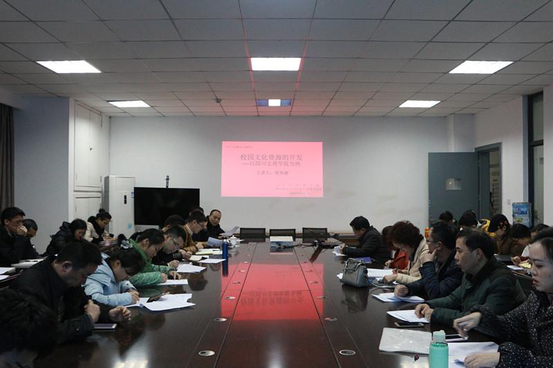 2016年12月22日下午,四川省青少年文学艺术社科普及基地、四川文理学院文学与传播学院在艺术传媒大楼1007会议室进行本学期第四次文学与传播讲坛活动,由胡郑丽老师作关于校园文化资源开发模式探究的讲座,讲座的主要内容是四川文理学院的校园文化资源的开发与建设。此次讲座以老师间的学术交流为主,文传学院大部分老师均参加了此次讲座并提出了自己的学术建议。
