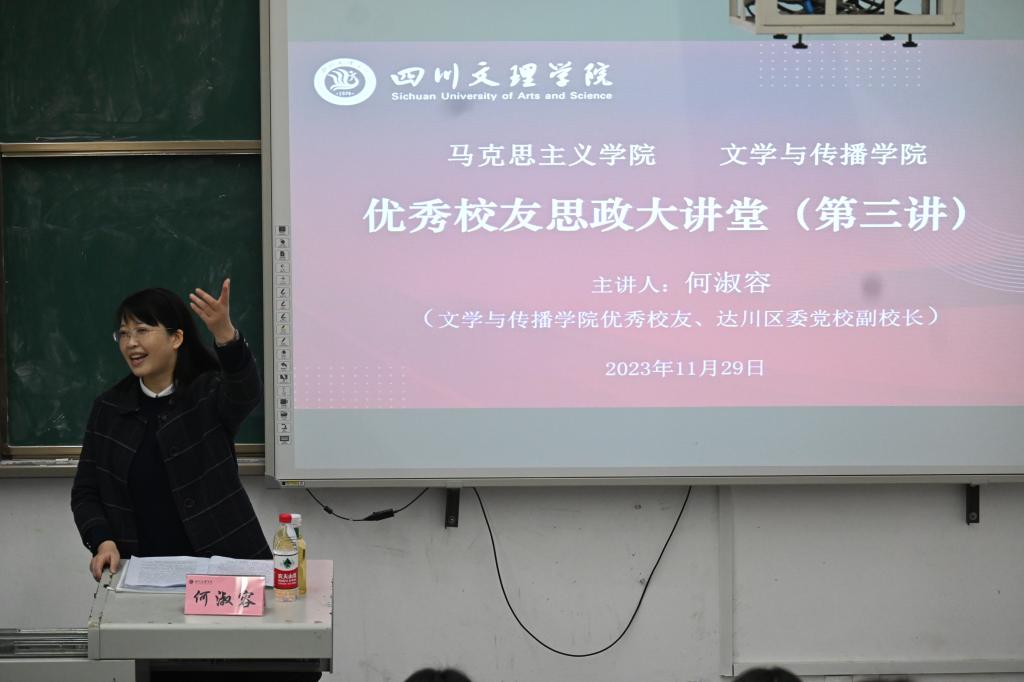 11月29日下午,文学与传播学院与马克思主义学院于艺术传媒楼1028教室联合举行“双周学术讲座”暨“优秀校友思政讲座”。本次讲座由文学与传播学院优秀校友、达川区委党校副校长何淑容主讲,我院2023级汉语言文学专业同学、学生党支部党员及入党积极分子代表现场聆听讲座。