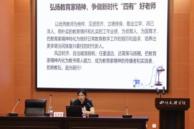 4月15日晚,学院双周学术讲座第二期特邀达州技师学院组织人事科科长范明英,作了题为“弘扬教育家精神,争做新时代‘四有'好老师”的学术讲座。此次活动由学院副院长成立主持。