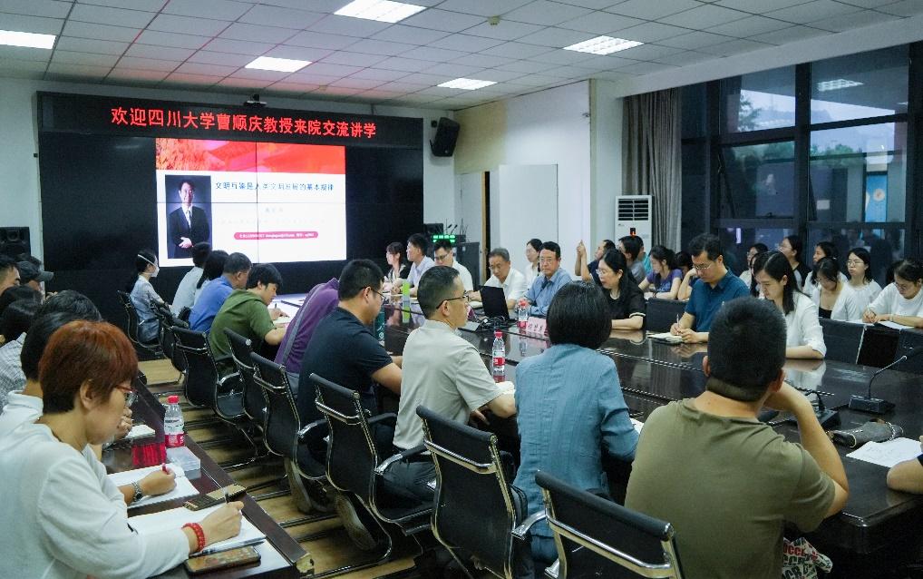 6月6日,欧洲科学与艺术院院士、四川大学文科杰出教授、文学与新闻学院学术院长曹顺庆教授受邀来校作题为《文明互鉴是人类文明发展的基本规律》的学术讲座。副校长程碧英教授主持讲座,来自文学与传播学院、中华传统文化学院、外国语学院、四川革命老区发展研究中心等部门的80余名师生到场学习交流。