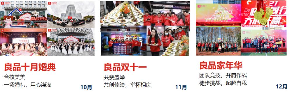 良品铺子秉承着“品质·快乐·家”的企业文化本源,注重员工的培养与成长,努力给所有员工营造家的归属感。公司倡导“尊重人·培养人·成就人”的用人理念、“激情共创·快乐分享”的团队精神。