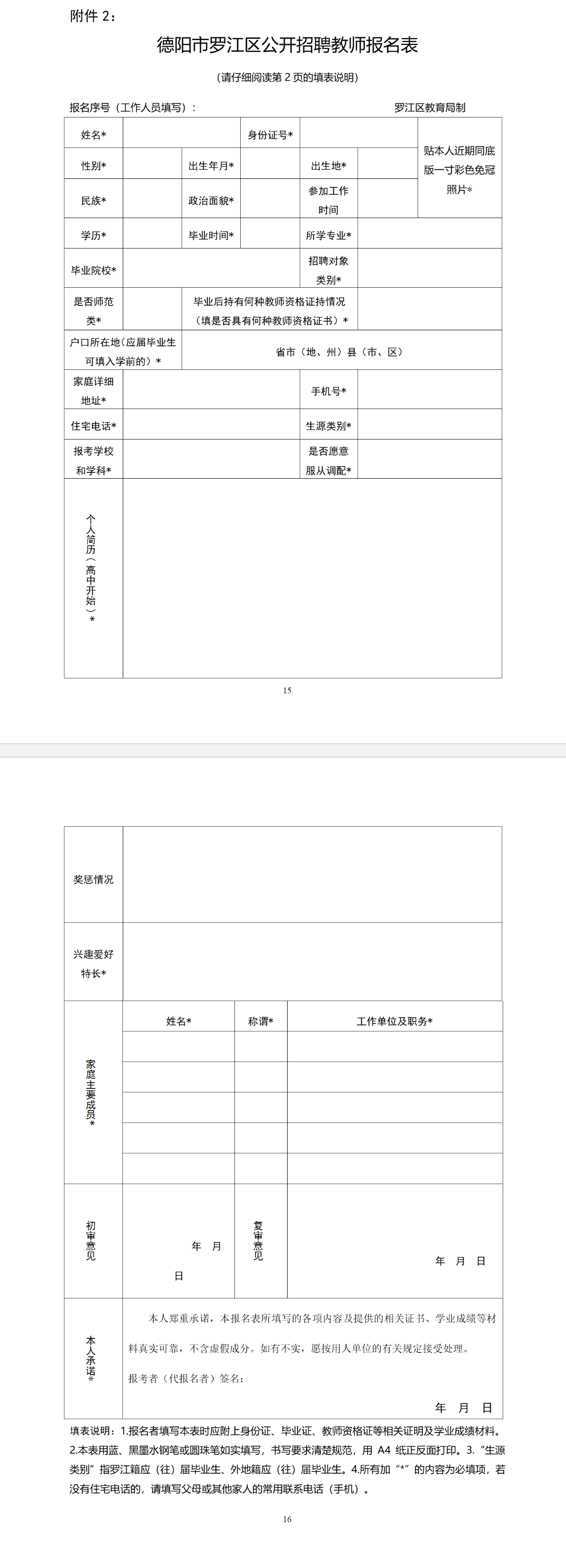(3)报名需提供以下相关材料:①《德阳市罗江区公开招聘教师报名表》(附件2);②个人简历;③身份证复印件;④2023届考生提供学生证原件及复印件;⑤2023届考生提供考试成绩证明(现有成绩);⑥毕业证、学位证书、教师资格证书、其他各类各级等级证书原件及复印件(2023届毕业生最迟2023年7月31日补交)及获奖证书复印件。