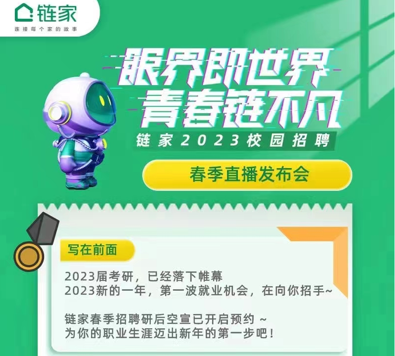 此次招聘采用“行业大拿分享+岗位引入+多轮抽奖”等方式开启对疫情后的房产行业发展全面的解析,带来不一样的招聘求职体验。直播宣讲时间:3月1日 晚19:00直播宣讲平台:成都链家官微 微信视频号平台 招聘联系人:王欢15884625883(同微信)同学们可提前扫描海报上方二维码预约参与直播(准备好简历也可以直接扫码投递)