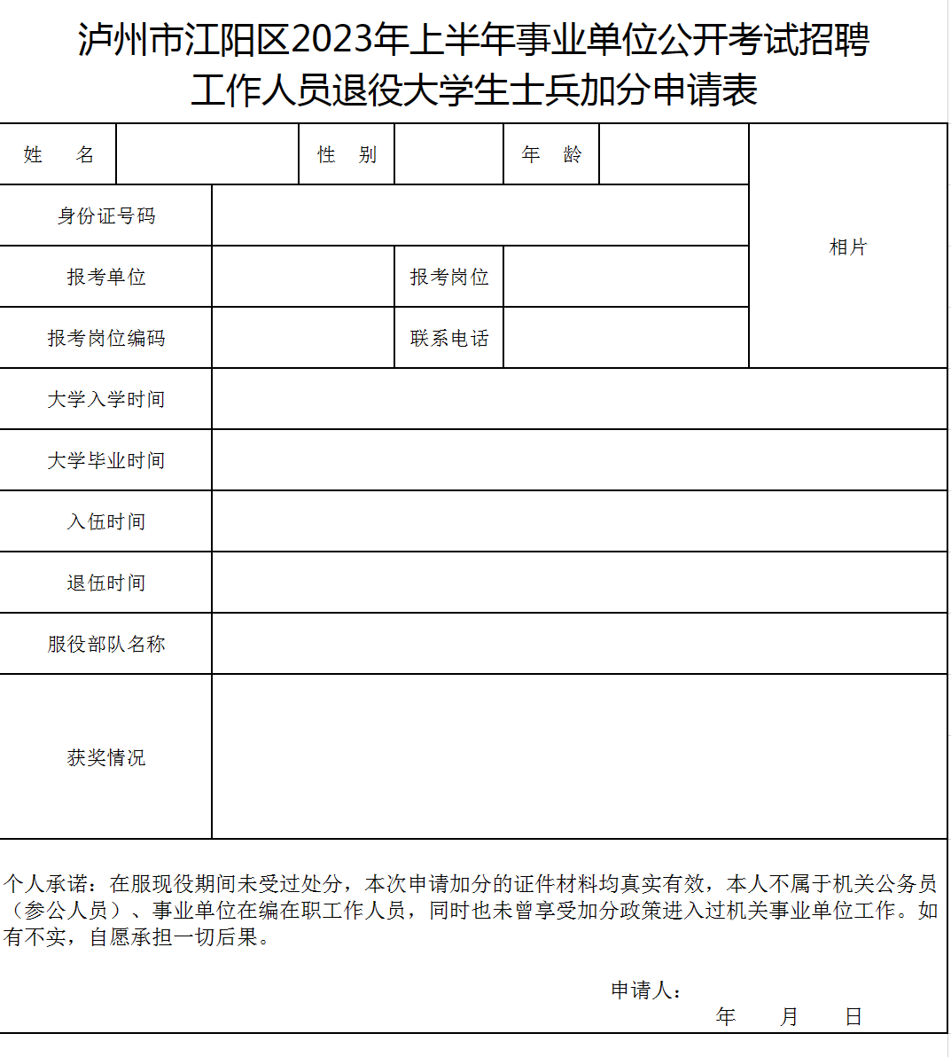 附件3-泸州市江阳区2023年上半年事业单位公开考试招聘工作人员退役大学生士兵加分申请表.xls