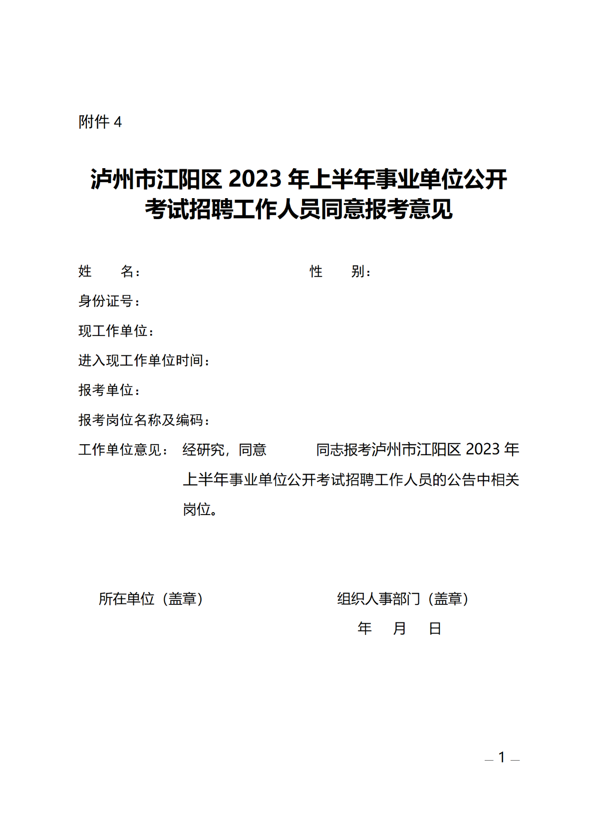 附件4-泸州市江阳区2023年上半年事业单位公开考试招聘工作人员同意报考意见.doc