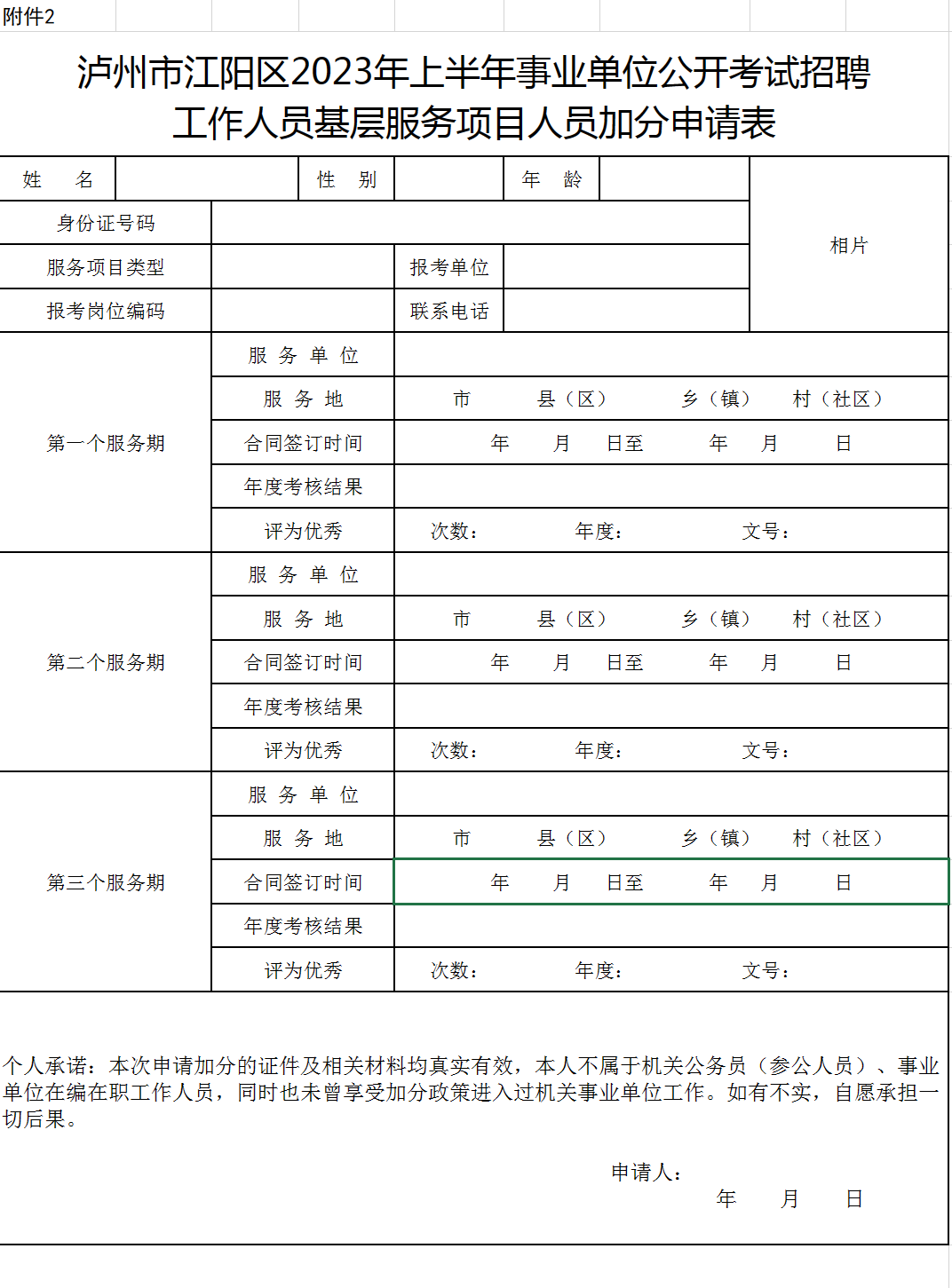 附件2-泸州市江阳区2023年上半年事业单位公开考试招聘工作人员基层服务项目人员加分申请表.xls