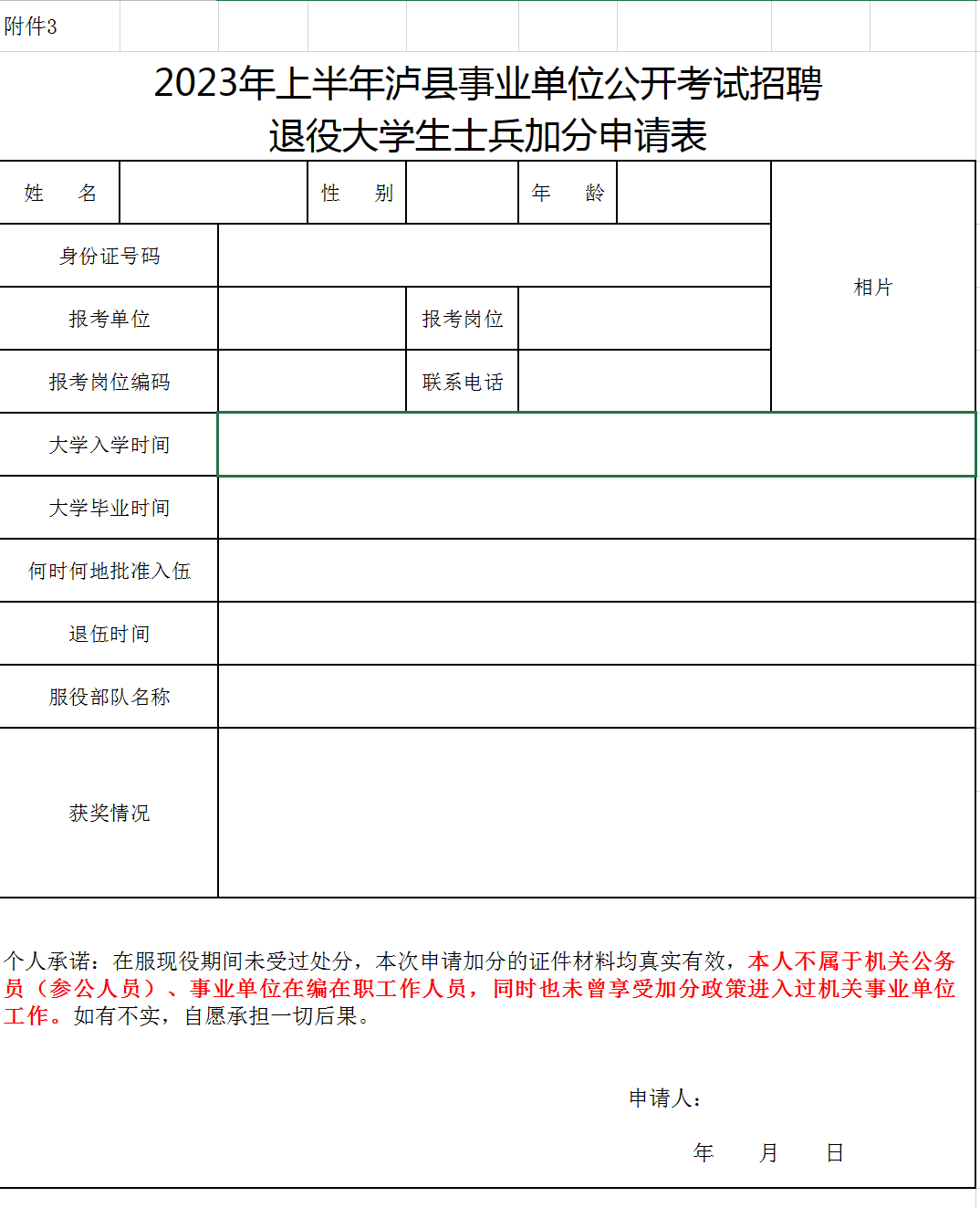 (2)申请加分的退役大学生士兵,须提供本人有效的《退出现役证》、《优秀士兵(义务兵)证》、有关奖励证书(证章)和相关学历证书、身份证、报名信息表、本人亲笔签名的加分申请表(附件3)等材料。