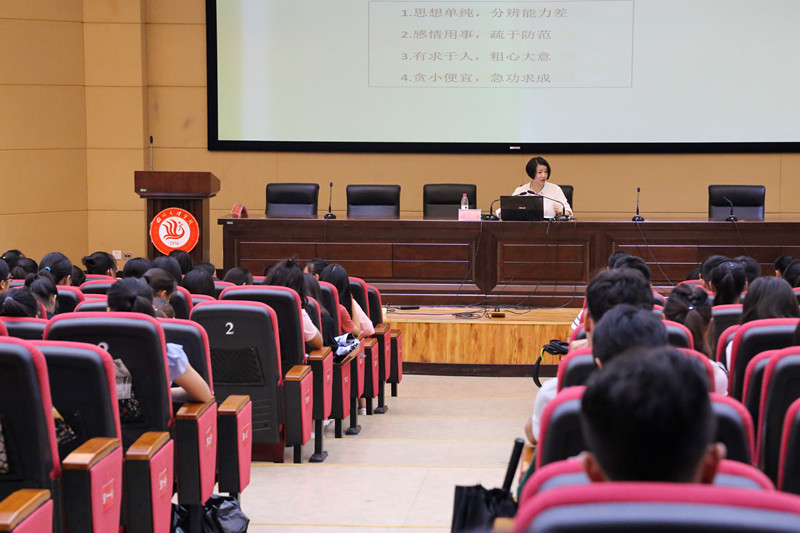 17日下午16:50,文传学院学工办主任、团总支书记王文娟老师主讲了 “大学安全知识”讲座,讲座开始。王文娟老师先带领新生学习了学校校歌《凤凰欲飞》,整场讲座在舒缓的歌声中拉开帷幕。首先王老师向同学们讲了校园诈骗手段,而这些诈骗分子主要通过抓住在校大学生单纯的性格特点,王老师重点提醒同学们在日常生活中不要贪图便宜、谋取私利,助人为乐要提高警惕,发现可疑人员要及时报告,若上当受骗更要及时报案,文明上网的同时警惕网络诈骗。关于寝室防盗方面,王老师提醒同学们养成外出随手关锁门的好习惯,贵重物品要放入带锁的衣柜或抽屉内,银行卡不与身份证件放一起。对于寝室安全预防,王老师告诫同学们切勿使用大功率电器、乱接电线,不吸烟,不乱接电线,不在宿舍存放易燃易爆物品,不擅带家用电器。王老师还提出我们当代大学生应当坚定党的领导,爱国、爱校、爱国家是大学生最基本的要求。最后,王老师提醒全体同学一定要注意节假日安全,特别要乘车安全,严禁搭乘非法无牌照汽车。