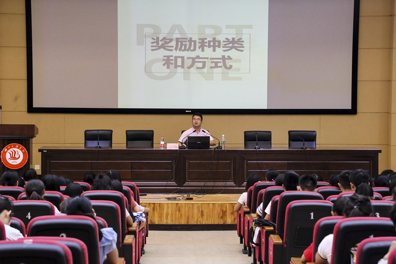 辅导员邓超老师为2017级新生解读《四川文理学院学生奖励实施方法》,邓超老师从奖励的种类和方式、奖励条件、奖励比例和方法、评选和组织实施四个方面向同学们作了全面的讲解。奖励的种类包括个人奖励项目、集体奖励项目。包括优秀青年志愿者、优秀学生团干部、优秀道德风尚、科技型创新创业实践类奖等奖项。在奖励方式方面,学校将颁发给获得奖励的先进个人与集体授予荣誉证书和奖杯。个人评优选先应从思想情况、学习成绩、纪律处分、身体素质四个方面达标后才能进行评选,关于集体评优选先,支部人员应该认真完成学院要求的任务、无违纪违法行为、教室及寝室卫生应在良好以上、集体成员学习应该勤奋刻苦。邓超老师不仅鼓励学生在学校内参加比赛,更希望学生可以多参加校外比赛,参加国家级、省级比赛,如大学生艺术节、万峰国际微电影、省级创新创业比赛等。最后,邓超老师鼓励同学们:既要仰望星空,又要脚踏实地,把握生命的每一分钟,鲜花和掌声的背后是孤独和痛苦,没有人可以随便成功!他希望2017级新生在大学里可以思想自由、人格独立、求学上进、奋斗拼搏!