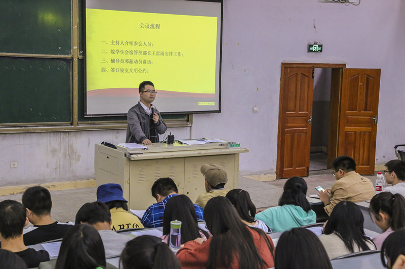 在大会上,邓超老师向同学详细介绍了此次会议内容:寝室内务、安全隐患、各项检查条例要求以及签订寝室文明公约等。他强调,寝室是同学们在学校的家,每位同学都有责任和义务管理寝室卫生。随后,宿管部部长王雷雨、副部长杨轲茗、包世鹏分别对寝室内的各项要求、寝室内务、以及对晚归同学的查处、寝室安全隐患等问题作出详细说明。邓超老师也通过展示寝室内务卫生等照片进行对比,对良好卫生寝室和较差卫生寝室分别作了赞扬和批评,进一步讲明寝室卫生与我们身体健康的切实关系,将卫生环境差的危害落实到我们生活的方方方面。在寝室安全隐患方面,邓老师选取真实事件案列并结合寝室使用大功率电器所带来的弊端给同学们深刻讲解,同时就学院近期寝室工作作出相关部署。