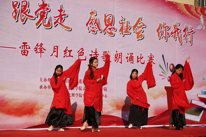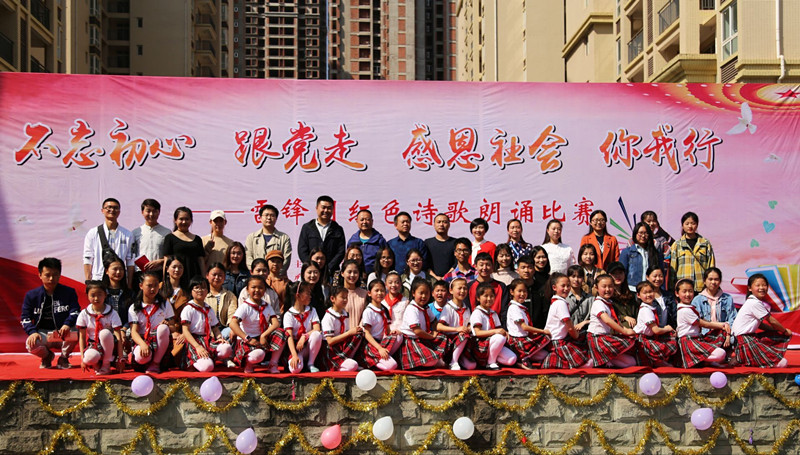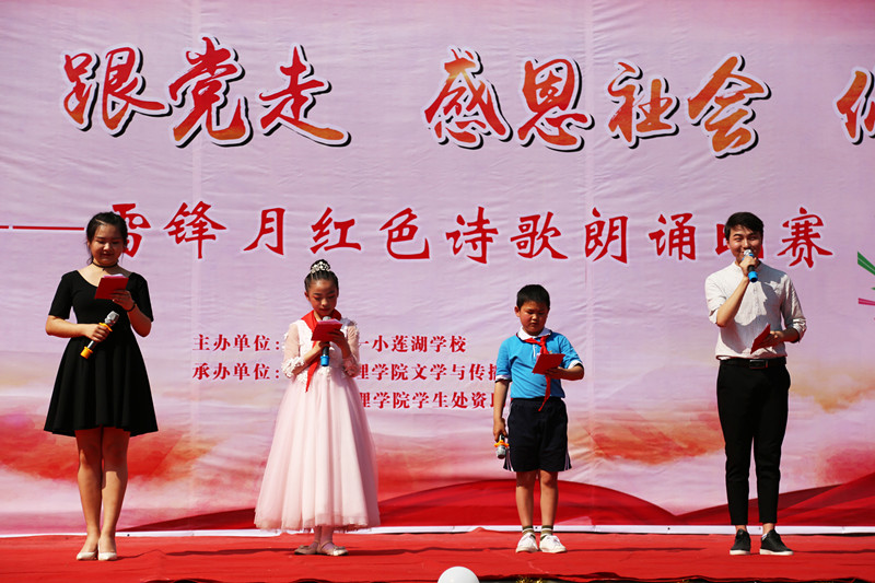 3月30日上午,“不忘初心跟党走•感恩社会你我行”雷锋月红色诗歌朗诵比赛在通川区一小莲湖校区成功举行。此次比赛由四川文理学院文学与传播学院、学生处资助中心、校团委、四川省青少年文学艺术普及基地和通川区一小莲湖校区联合主办,四川文理学院文学与传播学院青年志愿者协会承办。通川区一小莲湖校区党支部书记张冲、副校长张波、党支部副书记张芳溶、工会主席赵莉丹、唐燕老师、学校学生处资助中心文敏思主任、罗天老师、文传学院教研室主任李彦翰和辅导员文敏熙老师担任此次评委。李雨欣、韩小龙、曹雨涵和唐成杰主持本次比赛,文学与传播学院团总支学生会成员、党员和预备党员为此次比赛提供后勤保障。