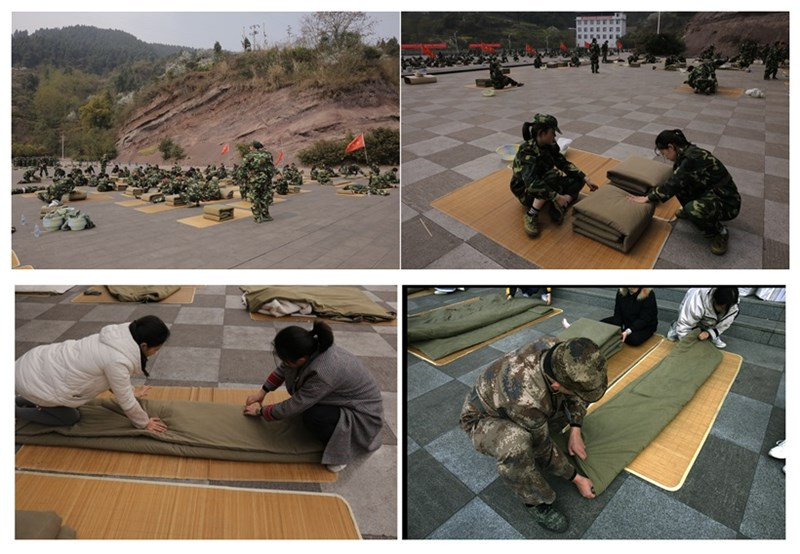 入营的第一堂课以整理内务——叠被子为起点体验军训生活,这对于我院学子来说是一个不小的挑战,但在教官倾心的教学指导下,学员们从开始的懵懂,到互相合作,一丝不苟的学习,一床床凌乱的被子在他们的巧手下瞬间变得棱角分明,整整齐齐,从量的改变到质的飞越,一步步走向成功,迷彩军装与英姿飒爽的气质相得益彰。小小的叠被就让同学们感受到了军训的严格,学会从细节入手,从小事做起,从而能够以更好的状态适应此次军训。