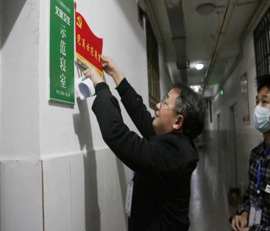 院长曾宪文亲自为党员示范寝室挂贴党员示范牌,希望各党员寝室能够营造安全舒适,干净整洁,氛围良好的寝室环境,起好模范带头作用。