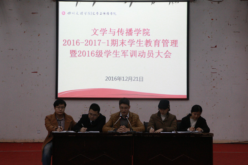 为了端肃考风考纪、加强学生思想教育以及动员大一同学积极参加军政训练,12月21日晚,我院在一教楼126教室召开了文学与传播学院2016-2017期末学生教育管理暨2016级学生军训动员大会。党总支副书记张桢老师、学工办主任(兼团总支书记)王文娟老师、辅导员彭娜、邓超、文敏熙老师、团总支学生会主席团和各班班长、学习委员以及2016级全体学生参加了此次会议。