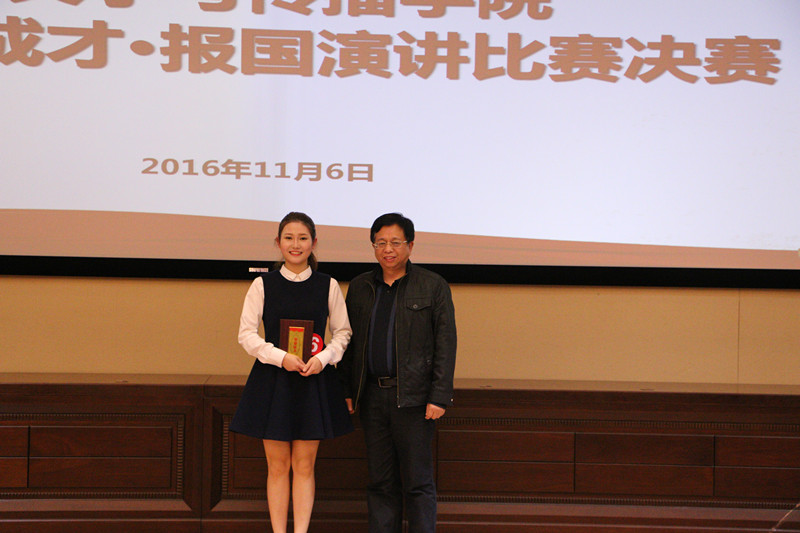 比赛结束后,播音与主持艺术教研室主任李彦翰老师对选手们的演讲进行了点评,他肯定了同学们的精彩之处,同时也指出了存在的不足,并提出了演讲需要达到“上口、顺耳、入脑”的要求。随后院长杜松柏教授做了总结讲话,他就选手们的演讲表现做出了中肯的评价,杜院长希望同学们在演讲稿中要增强文化底蕴,在演讲表达中要加强演讲技巧训练,在以后的学习中多培养文稿写作等能力。颁奖典礼结束后,选手和各位评委、嘉宾合影留念。一年一度的修身•成才•报国演讲比赛丰富了2016级新生们的大学生活,使他们树立了远大志向,增强了爱国情怀,同学们懂得了只有不断修炼自身、努力成才,才能够为建设祖国而发光发亮。