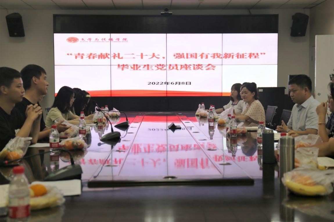 6月8日,我院在艺术传媒楼1007会议室召开了以“青春献礼二十大,强国有我新征程”为主题的座谈会。会议由学院党总支副书记张俊峰主持,党总支书记冉林、正处级组织员张波、学生第二支部书记文敏熙、辅导员肖旭、宋涛老师、学院22届毕业生党员参加会议。
