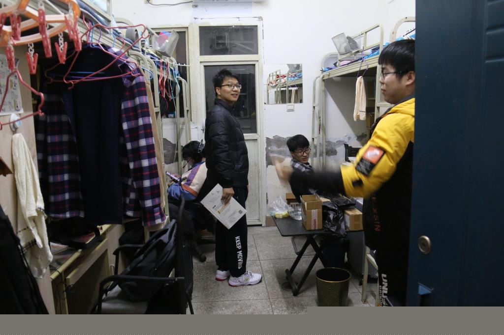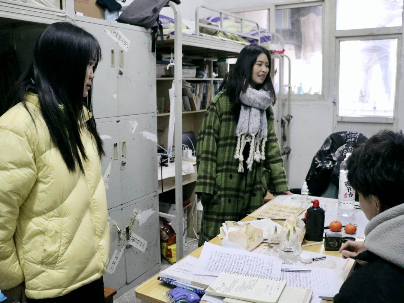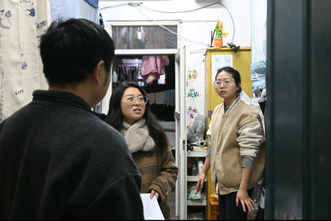 “同学,你好!老师来看你们啦”宿舍楼里响起老师们亲切的话语。寝室内,老师提醒同学们天气降温变化较大,要注意添衣保暖,鼓励大家认真复习准备即将到来的期末考试。同时,教育同学们不要在寝室使用“热得快”、电热毯等大功率违规电器,在宿舍生活中注意用电安全,出门前要记得切断电源。