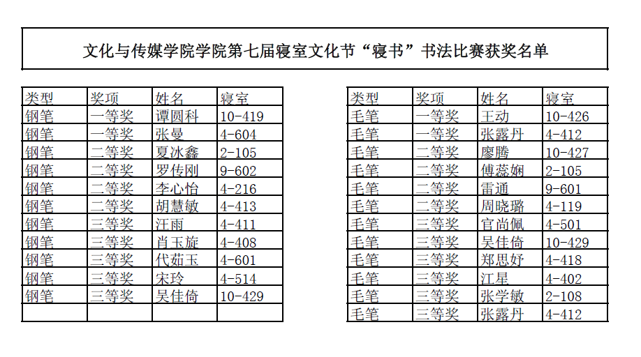 为提升宿舍文化内涵,营造良好的舍风和学风,4月8日下午4:30,文传学院在传媒大楼艺术展览区举行了第七届寝室文化艺术节·“校园‘寝’书”书法比赛。本着公平、公正、公开的原则,经过评委的认真评选,现将比赛结果通知于后: